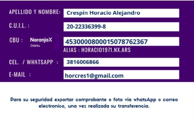 El costo total de la materia es por parcial se puede realizarlo en 2 pagos hasta antes de rendir el parcial, el costo está sujeto a aumentos de precio en casos que lo hubiere durante el cuatrimestre. Los pagos pueden realizarlos por transferencias, rapipago o pago fácil. Los pagos se realizan del 01 al 08 de cada mes, en caso de no poder para esa fecha me avisan me confirman por privado. Cada vez realizado el pago se debe enviar comprobante de transferencia o pago al profesor vía WhatsApp o correo. El pago lo deben realizar por transferencia a la siguiente cuenta: